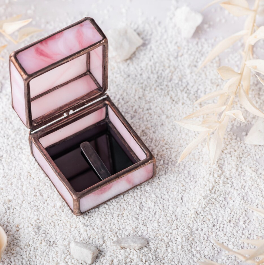 This gorgeous handmade ring box is made to order just for you by two brothers in Lviv, Ukraine. Their family has a stained glass business, from which these beautiful little boxes were born.