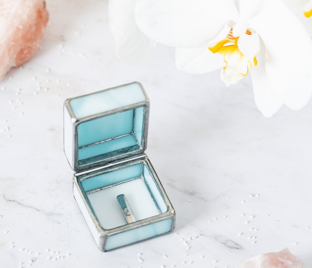 This gorgeous handmade ring box is made to order just for you by two brothers in Lviv, Ukraine. Their family has a stained glass business, from which these beautiful little boxes were born.