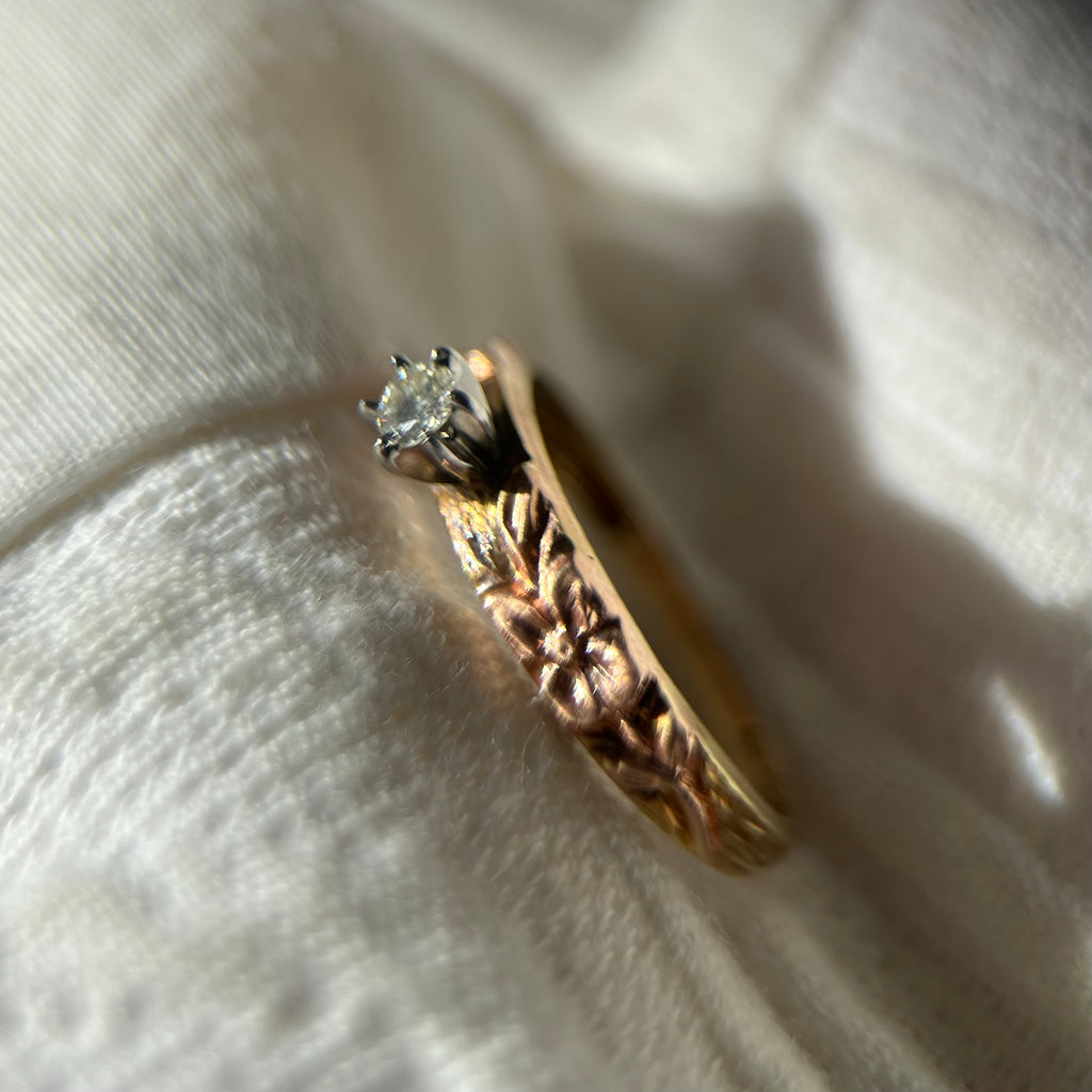 This sweet set of solid gold rings includes mixed gold of rose, white, and yellow gold in a beautiful rose carved design. Identical except one has a 0.15 carat round diamond (the moon!) for a pair of rings that represent the moon rising over the roses.