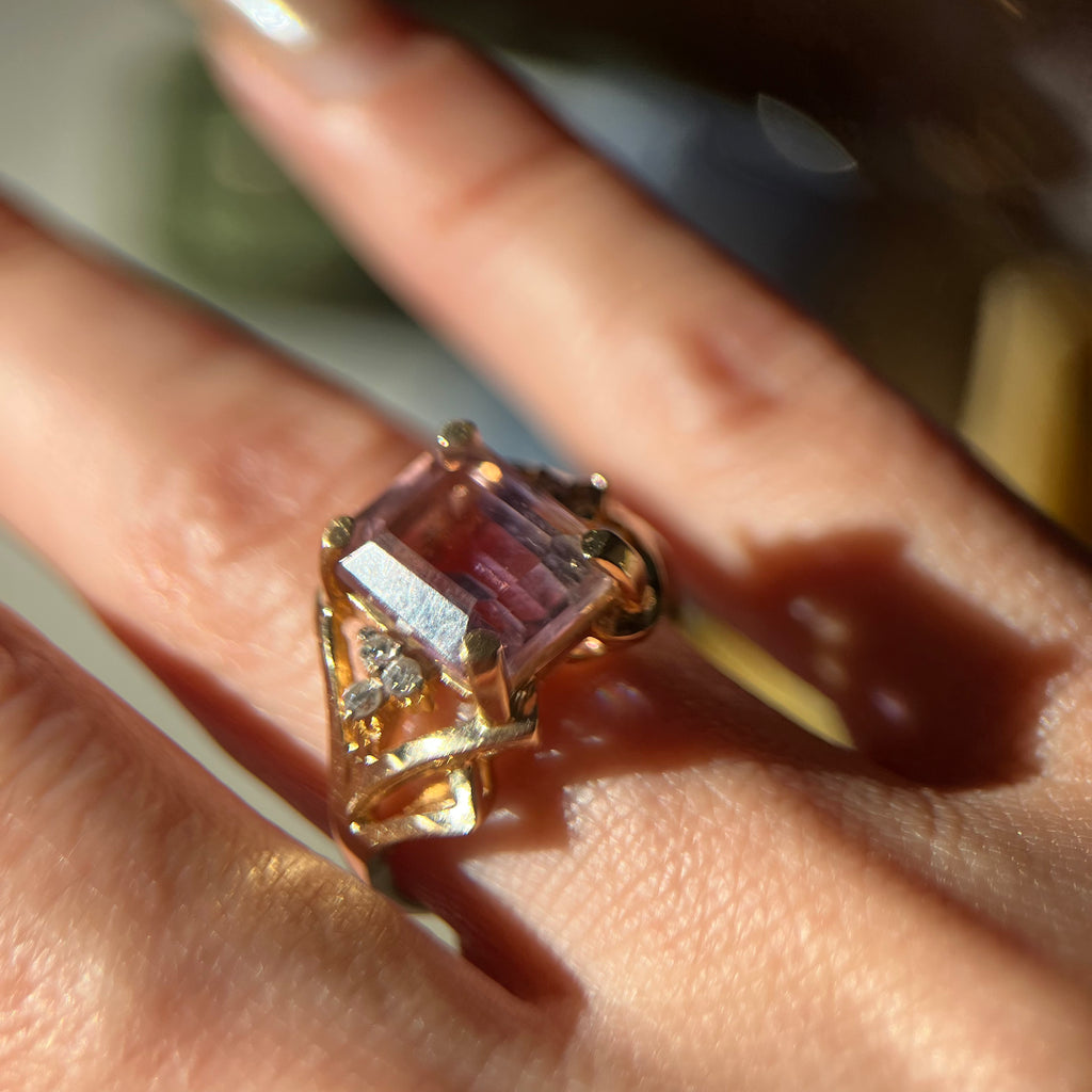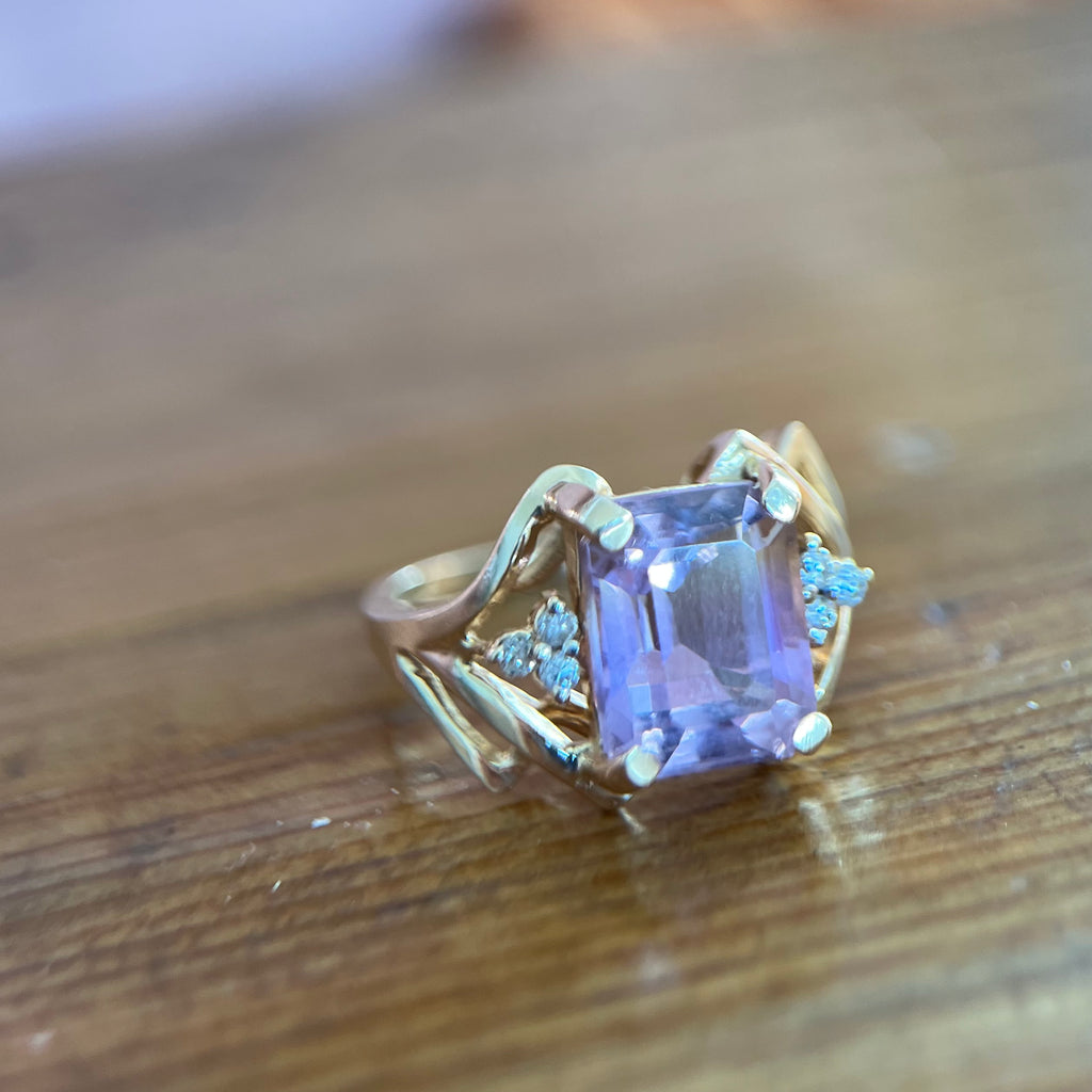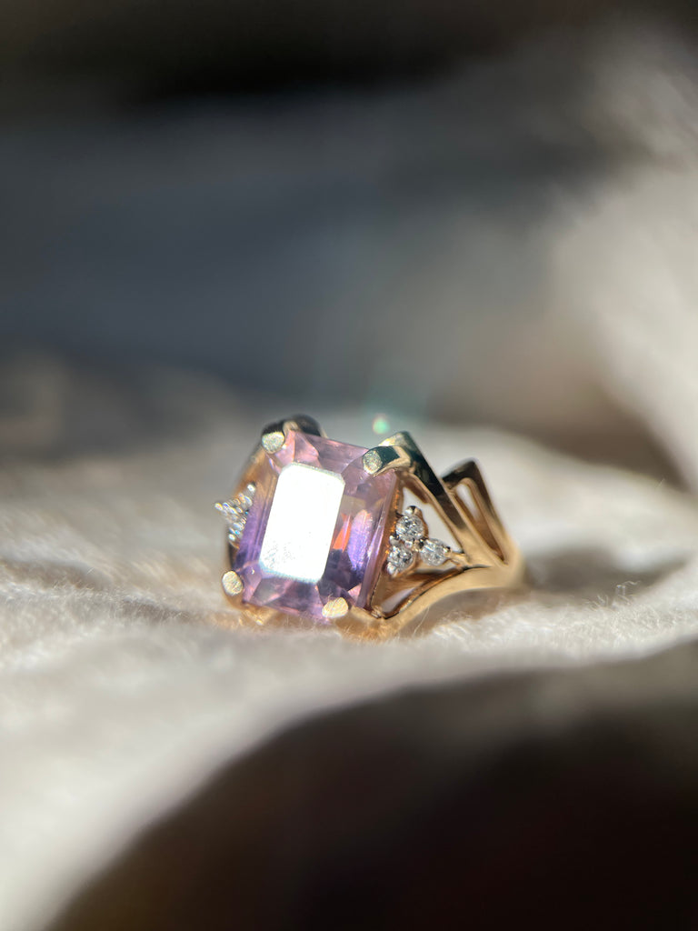 SO UNGLAUBLICH. Dieser süße Ring aus den 1980er Jahren ist ein Feld aus Flieder und Sonnenschein, eingefangen in diesem perfekt smaragdgeschliffenen Stein, umgeben von Diamantfunkeln und massivem Gold.