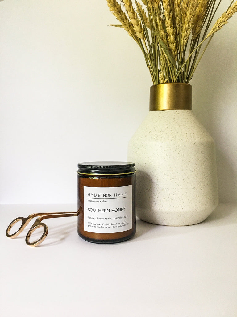 「ヴィーガンである私にとって、動物性原料を一切含まないキャンドルを作ることが重要でしたが、さらに一歩進めて、毒素、フタル酸エステル類、添加物、染料、環境に優しい製品を作りたかったのです。何時間も研究、テスト、開発を行った結果、HYDE NOR HARE キャンドルは 100% 大豆ワックス、綿と紙だけで作られた生の芯、フタル酸エステル不使用のフレグランス オイル、ガラスの瓶と金属製の蓋。それだけです。純粋でシンプルです。ああ、香りも素晴らしいです。提供されるフレグランスはどちらも慎重に厳選され、カスタムブレンドされた香りで、主に自然、放浪癖、季節の変化からインスピレーションを得ています。また、寄付金の 5% を寄付します。私たちの利益はJP Farm Animal Sanctuaryに寄付されるので、購入についてさらに安心していただけます。」