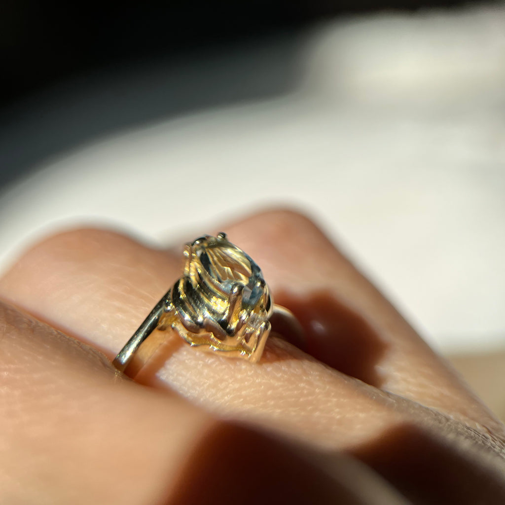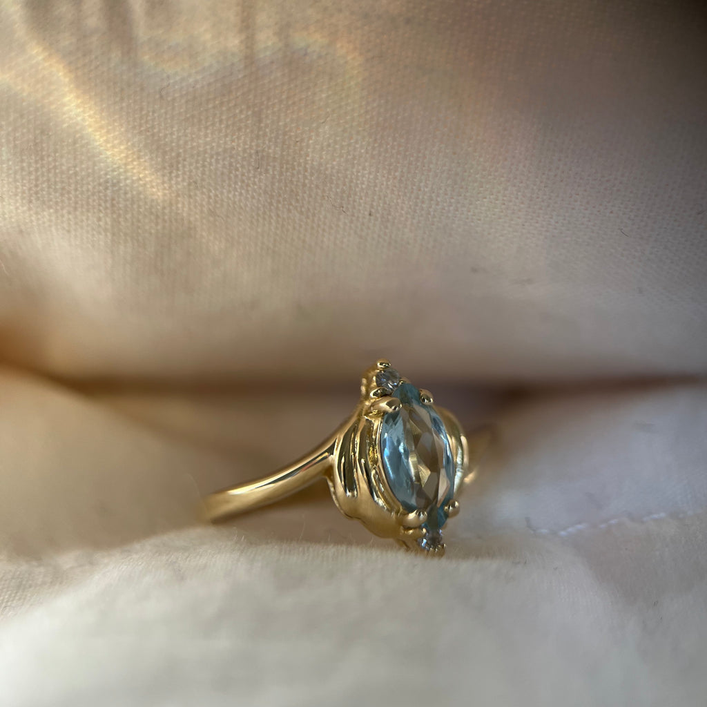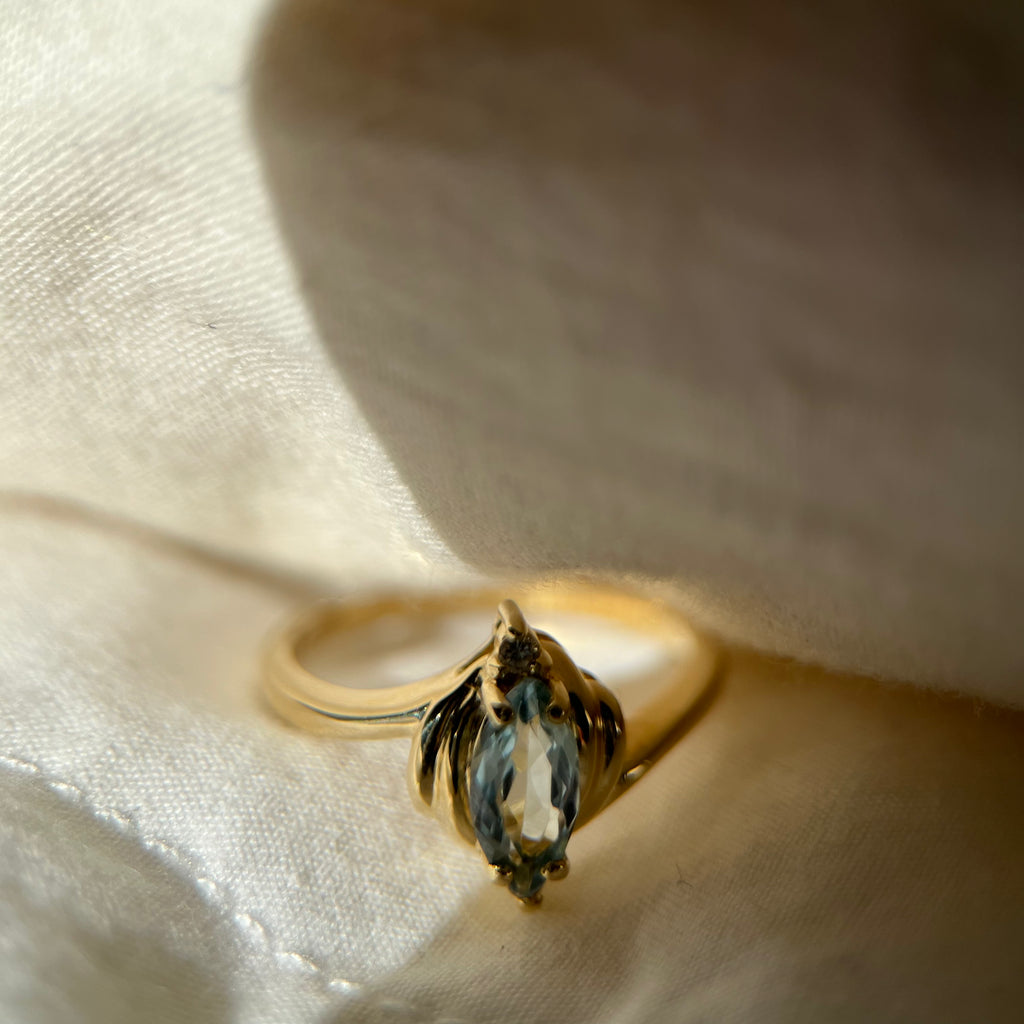 スカイ ヨニ リング: 1970 年代のナチュラル マーキス カット 1.37 CT アクアマリン、ダイヤモンド付き 14K ゴールド