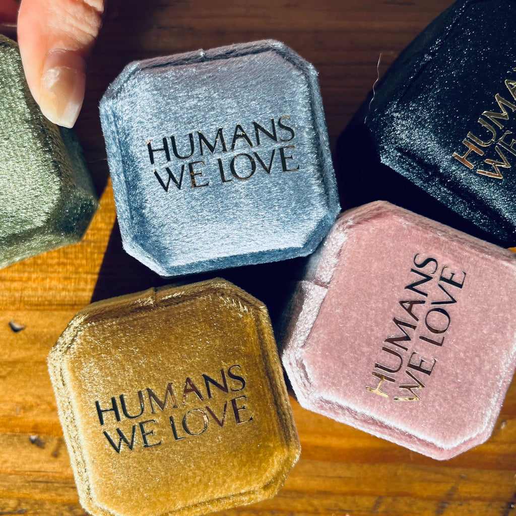 Humans We Love のヴィンテージ リングはそれぞれ、愛らしい小さな手作りのベルベットのリングボックスに入れてブルックリンから発送されます。リングボックスはリングを安全に保管するだけでなく、リングの保管にも使用できます。 Emin & Tuba は、いくつかの甘いベルベットの色でこれらをカナダで作成しました。非常にお気に入りがある場合は、注文時にご希望の色をお選びください。もし持っていたら送りますよ!ご注意ください - 各色数個しか持っていないため、売り切れの場合は、あなたのユニークなリングに最適だと思われる色をお送りします。